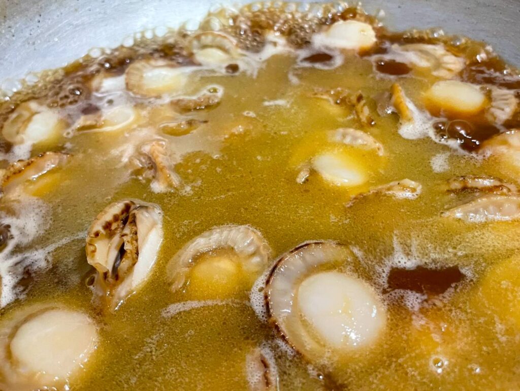 醤油とバターの香ばしさの中に、ホタテの甘いエキスがたっぷり溶け出した煮汁は、まさに「こくまろ」