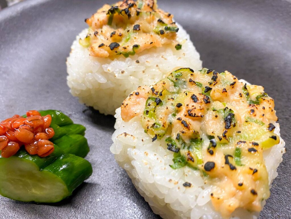 小さめのおにぎりをオーブンやフライパンで焼き、カリッとさせたら、表面に【ごろごろ鮭の贅沢おかず味噌】を塗ってさらにオーブンやトースターなど上火で香ばしく焼きます。