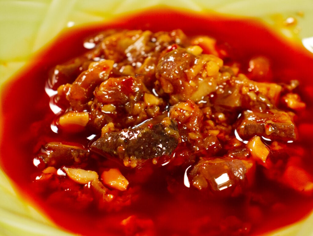 にんにく、生姜、ねぎといった香味野菜と新鮮な唐辛子を丁寧に調理し、干しエビやロースとカシューナッツなど、具材をたっぷり加えた「食べるラー油」。