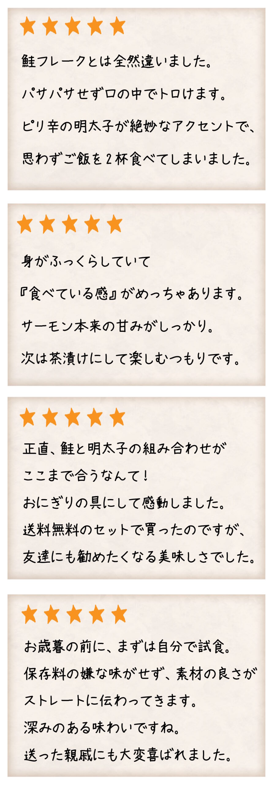 2【ちょっぴり贅沢】とろとろしゃけめんたい¥500 (税込価格 ¥540 )刺身用の新鮮なサーモンを使用職人が丁寧に焼きほぐしています。そのたっぷりの脂で、ほぐし身は「トロトロ」この極上の鮭に、福来純の料理酒や井上古式醤油といった伝統調味料をベースに、自家製柚子胡椒を加えた特別な明太子調味液で味付け。さらに明太子を贅沢に混ぜ込みました。鮭の濃厚な旨味と、ピリッと辛い明太子の刺激が至福のハーモニーを奏でます。 いつものご飯に乗せるだけで、食卓が一瞬で華やぎます。とろける鮭の旨味と旨辛な明太子の絶妙なバランスは、まさに「やみつき」です。※商品は真空・冷凍でお届けします。解凍するだけで作りたての美味しさをお楽しみいただけます冷凍 -
